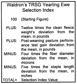 Each year, all ewe lambsexcept obvious cullswere placed on a range performance test. Selection of yearling ewes was based on the following formula, developed by sheep and goat geneticist Dan Waldron: