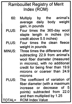 Each year the top 15 percent of ram lambs were selected based on EPDs and visual appraisal and enrolled in the Ram Performance Test at Sonora. The remaining ram lambs (except obvious culls) were placed on a range performance test. Both groups were evaluated according to the Rambouillet Registry of Merit Index (ROM).